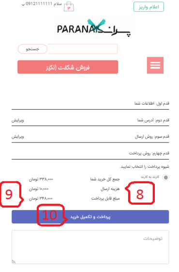 توی این صفحه شما می تونید هزینه حمل و جمع کل مبلغ پرداختی رو ببینید. بعد از اینکه جمع کل رو یادداشت کردید 10- رویپرداخت و تکمیل خرید کلیک کنید